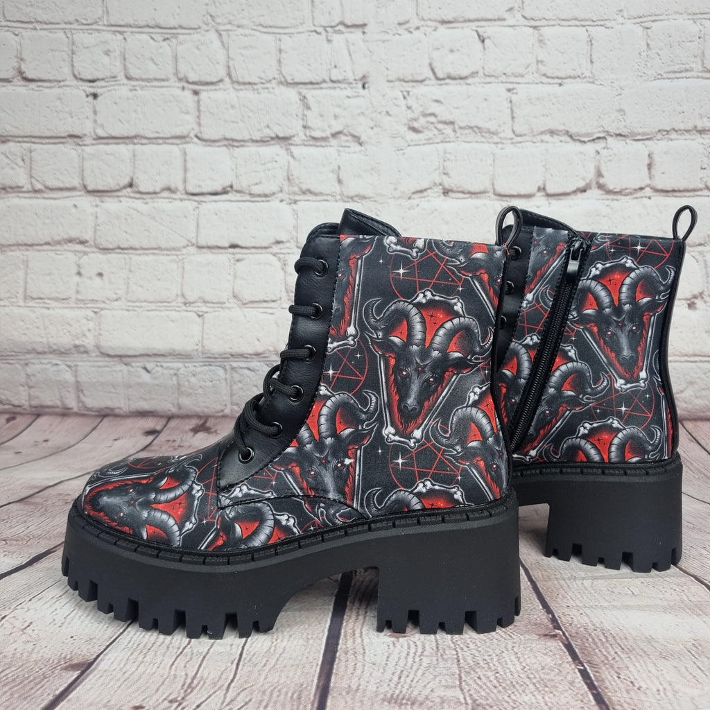 Rock your style with these awesome purple baphomed red goat print ankle boots!. Great gift for her! Friend, girlfriend, or any female, who doesn't love shoes?