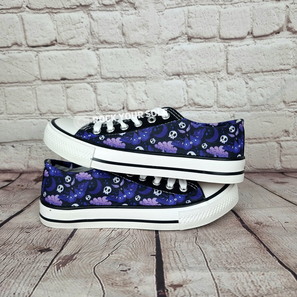Rock your style with these awesome purple goth moth sneakers!. Great gift for her! Friend, girlfriend, or any female, who doesn't love shoes?