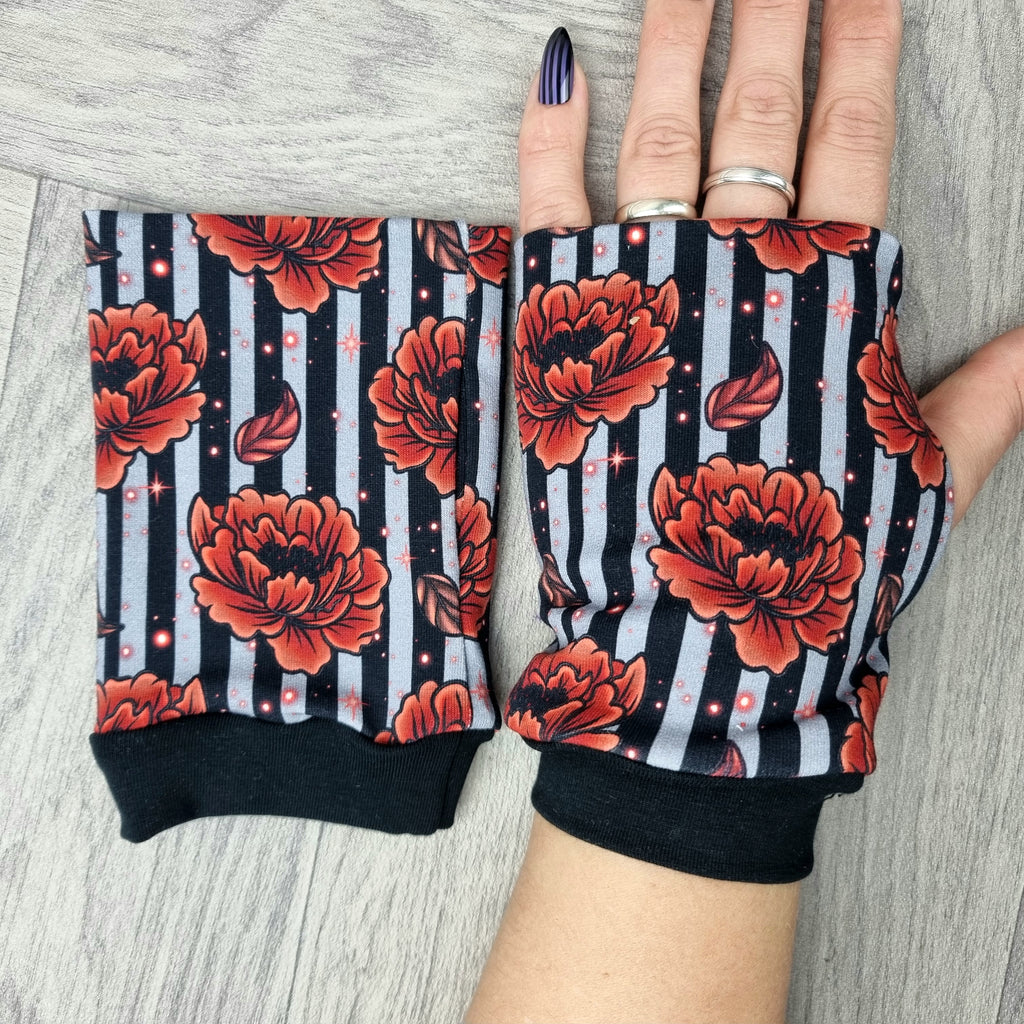 Red peony stripes fingerless gloves. Handmade alternative double-layer cotton French terry(hoodie) fabric fingerless gloves/ wrist warmers. These gloves will keep your hands warm and stylish!